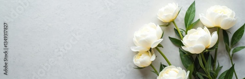 Fresh white peony flowers on light gray table background. Closeup wide banner with copy space for emotional, sentimental text, quote or sayings. Top down view, condolence card, invitation.