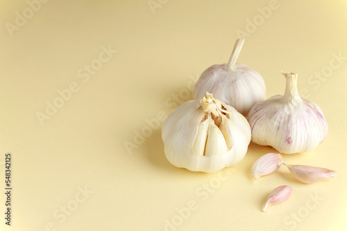 Fresh white unpeeled head bulb of garlic and garlic cloves on yellow color background. Vegan, organic, vitamins. Natural antibiotic, antioxidant, Allicin. Copy space for text