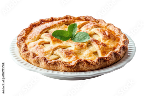Freshly baked apple pie garnished with mint leaves, cut out