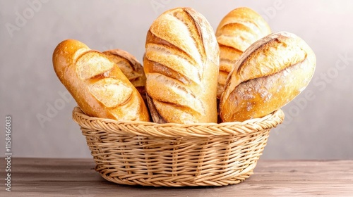 Freshly baked baguettes in a wooden basket kitchen food photography
