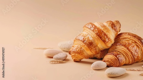 Freshly Baked Croissants with Stone and Wood Accents on Light Beige Background