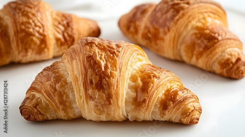 Freshly baked golden croissants arranged on a white plate, showcasing their flaky texture and warmth
