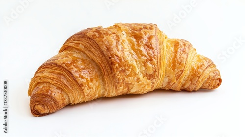 Freshly baked golden-brown croissant with a flaky texture and crisp layers, isolated on a bright white background.