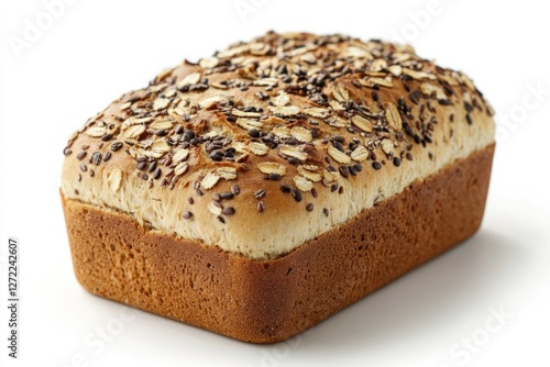 Freshly baked loaf of whole grain bread topped with seeds and oats