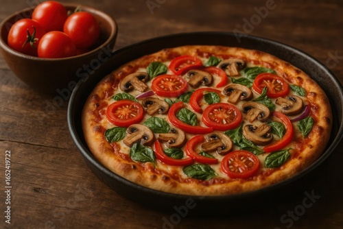 Freshly baked margherita pizza with juicy red tomatoes, creamy mozzarella cheese, and fresh basil leaves, served on a rustic wooden table alongside a small bowl of ripe cherry tomatoes