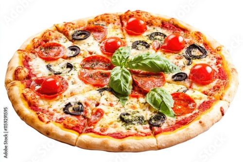 Freshly baked pizza with juicy tomatoes, green olives, and nutritious spinach leaves