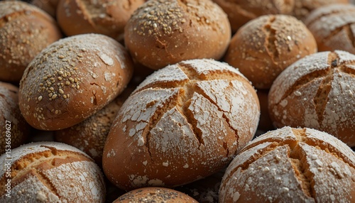 Freshly baked round artisan bread rolls with rustic crusts and flour dusting