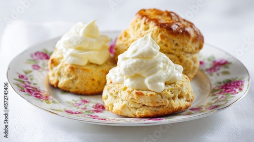 Freshly baked scones and clotted cream on floral plate, white backdrop