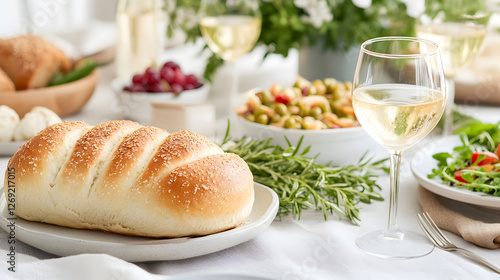 Freshly baked sesame bread on a ceramic plate with white wine and Mediterranean dishes in soft natural light. Perfect for food blogs, restaurant menus, and culinary advertising. Selective focus