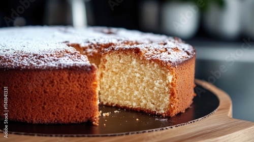 Freshly baked vanilla cake with a slice removed, showcasing its fluffy texture and lightly powdered sugar topping on a wooden board.