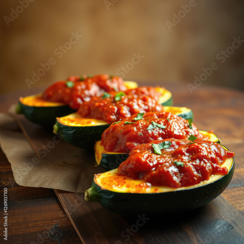 Freshly baked zucchini boats stuffed with cheese and smothered in marinara sauce, filling, stuffed, freshly baked, smothered