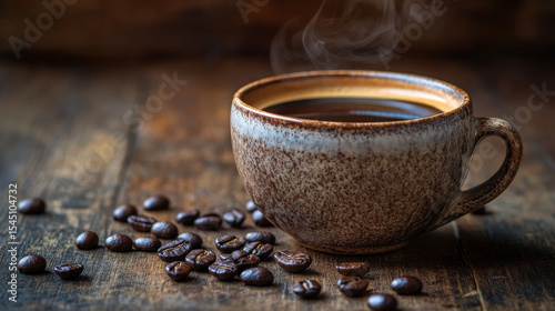 Freshly brewed coffee in a ceramic cup, steam swirling, placed on a rustic wooden table with coffee beans scattered, cozy morning ambiance, high-resolution photography —ar 16:9