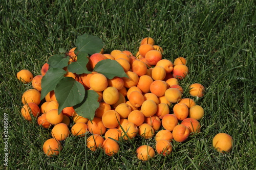 Freshly collected ripe apricots scattering with an apricot branch on the mown lawn