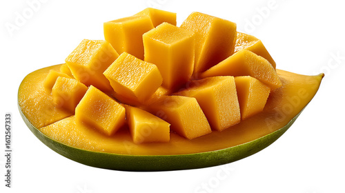 mango, fruit, tropical, food, fresh, ripe, cut, sliced, diced, cubed, juicy, sweet, exotic, healthy, snack, dessert, ingredient, organic, natural, photo, isolated, transparent, background, studio, shot, yellow, green, summer, refreshing, delicious
