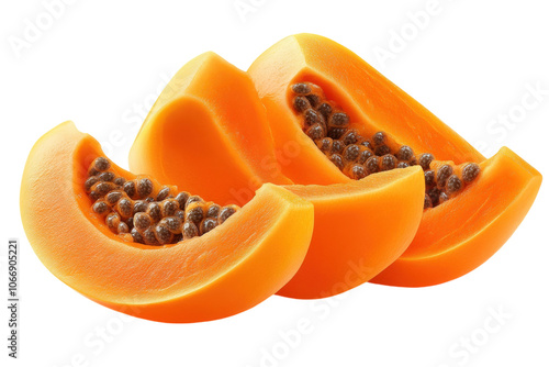Freshly cut papaya slices displayed on a white background, showcasing their vibrant orange color