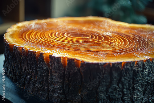 Freshly cut tree rings on a cross-section, revealing years of growth and environmental conditions. Concept of dendrochronology and ecological studies.