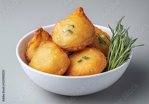 Freshly Fried Savory Pastries with Crispy Texture and Golden Hue Served in a White Bowl with Green Garnish for a Delicious Culinary Experience
