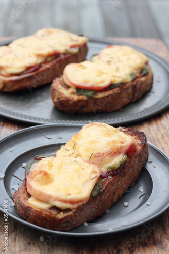Freshly grilled slice of bread with pickles, tomatoes, ham and melted cheese.