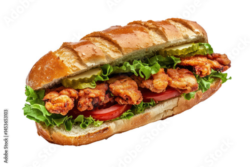 Freshly made crispy fried chicken sandwich with lettuce tomato pickle and mayonnaise on toasted baguette bread, delicious fast food meal option