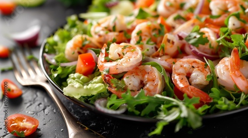 shrimp, lettuce, tomatoes, red onion, black plate, fork, meal, salad, vegetable, seafood, food, healthy, delicious, epicure, green