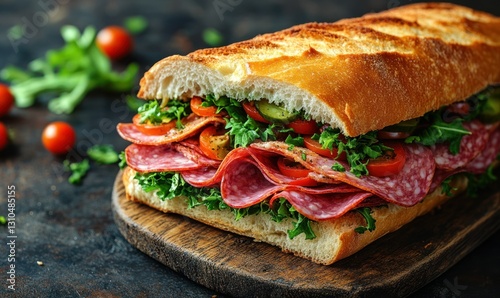 Freshly Made Sandwich with Salami, Fresh Vegetables and Crispy Bread on Wooden Board