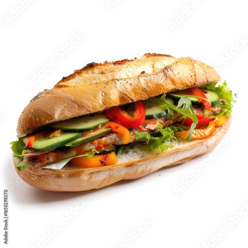 sandwich, food, lunch, meal, delicious, tasty, healthy, vegetarian, protein, grilled, meat, vegetable, bread, bun, fresh, crispy, cucumber, lettuce, tomatoes, red pepper, yellow pepper, salad, filling, ingredient, epicure, cookery, bakery, homemade, ready to eat, isolated, white background, appetising, snack, fast food, portable, easy, quick, flavorful, deliciously, carb, light meal