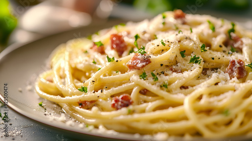 Freshly made spaghetti with creamy sauce pancetta and Parmesan