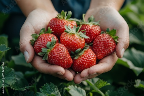 strawberry, hand, red, leaf, ripe, up, summer, close, organic, green, harvest, fresh, vitamin, snack, holding, hand, macro, delicious, agriculture, healthy, dessert, fruit, plant, farm