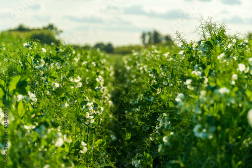freshly planted pea bushes on which young pea pods are visible