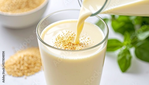 beverage, milk, grain, amaranth, glasses, vegan, healthy, drink, seed, vegetarian, diet, nourishment, breakfast, ingredient, food, white background, closeup, basil, herb, table, bowl, alimentary, well-being, wellness, raw, organic, natural, refreshment, tasty, delicious, antioxidant, protein, fiber, source
