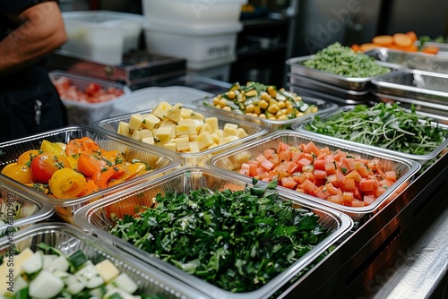 Freshly prepared vegetables and herbs arranged in containers at a bustling kitchen