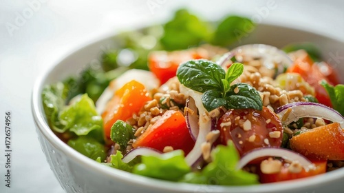 Freshly prepared vibrant salad with lettuce tomatoes red onion nuts and mint garnish food healthy vegetable