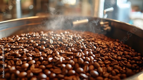 Freshly roasted coffee beans in a metal container, emitting steam and aroma.