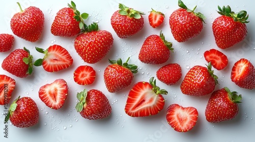 freshly sliced strawberries floating against a clean white background