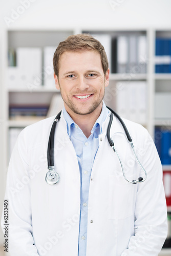 doctor, practice, friendly, hospital, man, medicine, physician, general practitioner, health, healthy, disease, sick, office, diagnostic, stethoscope, apron, white, boss, doctor, man, person, male, happy, serious, competent, smile, young, 30s
