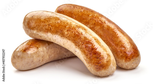 Fried bangers sausages, close-up, isolated on white background