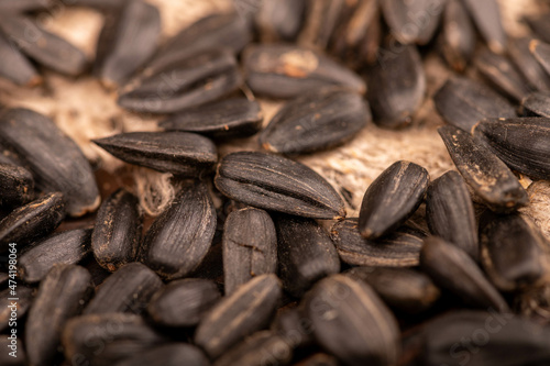 Fried black sunflower seeds scattered on the table, close-up, selective focus.