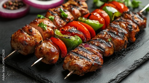 Fried chicken and lamb kebab on a black slate plate, decorated with red onion slices, green peppers, and tomatoes, peppercorn