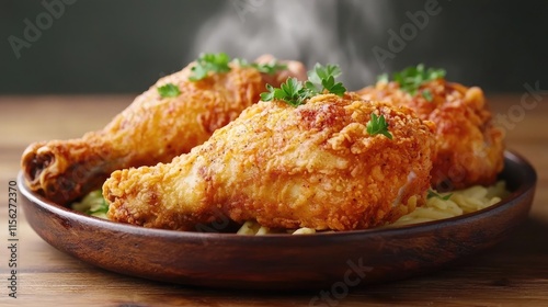 Fried chicken concept. Delicious golden fried chicken garnished with herbs, served on a wooden plate.