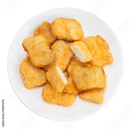 Fried chicken nugget on white plate isolated on white background, Fried nugget on white PNG file.