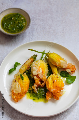 courgette, courgette, flower, vegetable, stuffed, ricotta, cheese, food, cookery, italian, fried, batter, tempura, crispy, snack, vegetarian, basil, sauce, pesto, herb, favor, culinary, dish, starter, cooked