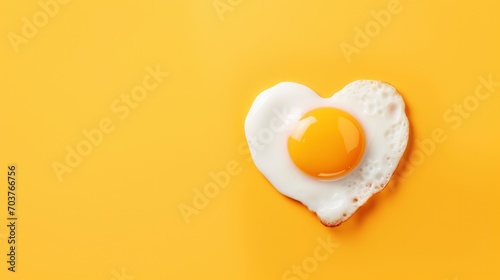 Fried egg in the shape of a heart on yellow background. Valentine's Day celebration.