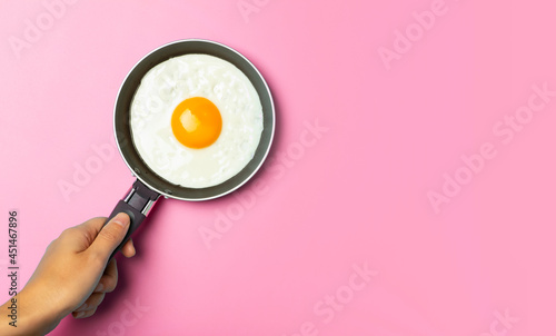 Fried egg is minimal. Fried egg in a frying pan on an empty pink background. Creative breakfast and food idea.