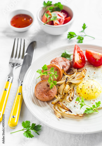 fried egg, sausage, tomatoes - tasty Breakfast or snack, on the bright plate on a light wooden background