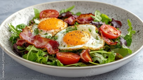 fried egg, bacon, salad, breakfast, healthy, food, delicious, tasty, fresh, ingredient, egg, pork meat, lettuce, arugula, tomatoes, cherry tomato, vegetable, cookery, meal, plate, bowl, white bowl, eatery, food photography, healthy eating, morning, diet, protein, epicure