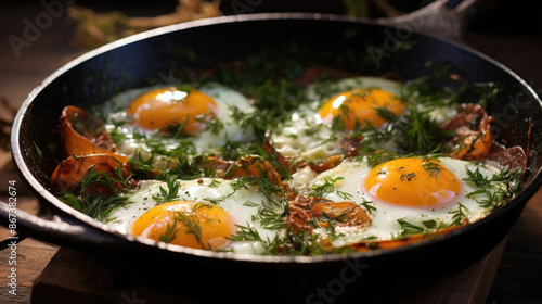 Fried eggs fried eggs spiced and herbs fried in a pan. Hot appetizing dish, close up,, generative ai