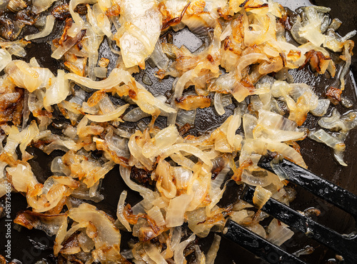 Fried onion close-up with a fork