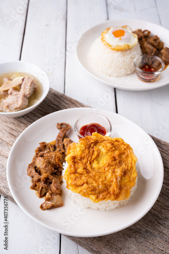 Fried Pork with Garlic, Pepper and fried egg on rice. Easy thai food.