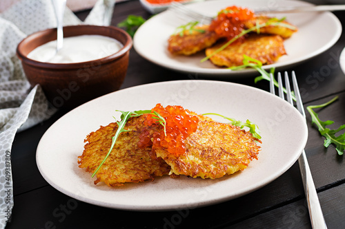 Fried potato pancakes with red caviar and sour cream, fritter, roesti. Traditional delicious food, lunch.