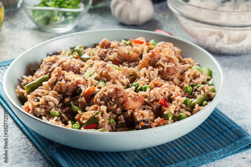 rice, fried, chicken, egg, vegetable, stir fry, fries, stir, food, asian, chinese, cookery, dish, meal, meat, dinner, lunch, snack, homemade, pepper, oriental, nobody, wok, pork meat, indian